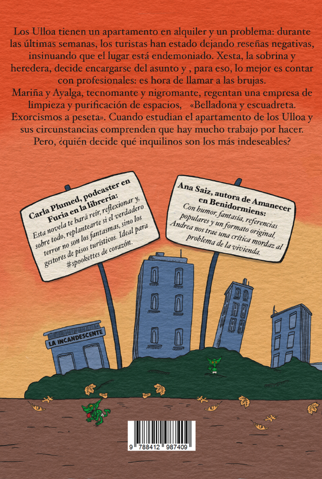 SINOPSIS: Los Ulloa tienen un apartamento en alquiler y un problema: durante las últimas semanas, los turistas han estado dejando reseñas negativas, insinuando que el lugar está endemoniado. Xesta, la sobrina y heredera, decide encargarse del asunto y , para eso, lo mejor es contar con profesionales: es hora de llamar a las brujas. Mariña y Ayalga, tecnomante y nigromante, regentan una empresa de limpieza y purificación de espacios, «Belladona y escuadreta. Exorcismos a peseta». Cuando estudian el apartamento de los Ulloa y sus circunstancias comprenden que hay mucho trabajo por hacer. Pero, ¿quién decide qué inquilinos son los más indeseables? Incluye Posfacio sobre casas encantadas.