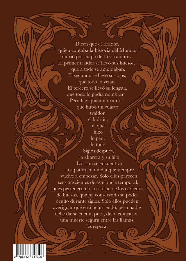 Dicen que el Erador, quien contaba la historia del Mundo, murió por culpa de tres traidores. El primer traidor se llevó sus huesos, que a todo se amoldaban. El segundo se llevó sus ojos, que todo lo veían. El tercero se llevó su lengua, que todo lo podía nombrar. Pero hay quien murmura que hubo un cuarto traidor, el ladrón, el que hizo lo peor de todo. Siglos después, la alfarera y su hijo Lorrian se encuentran atrapados en un día que siempre vuelve a empezar. Solo ellos parecen ser conscientes de este bucle temporal, pues pertenecen a la estirpe de los cércenos de huesos, que ha conservado su poder oculto durante siglos. Solo ellos pueden averiguar qué está ocurriendo, pero nadie debe darse cuenta pues, de lo contrario, una muerte segura entre las llamas les espera.